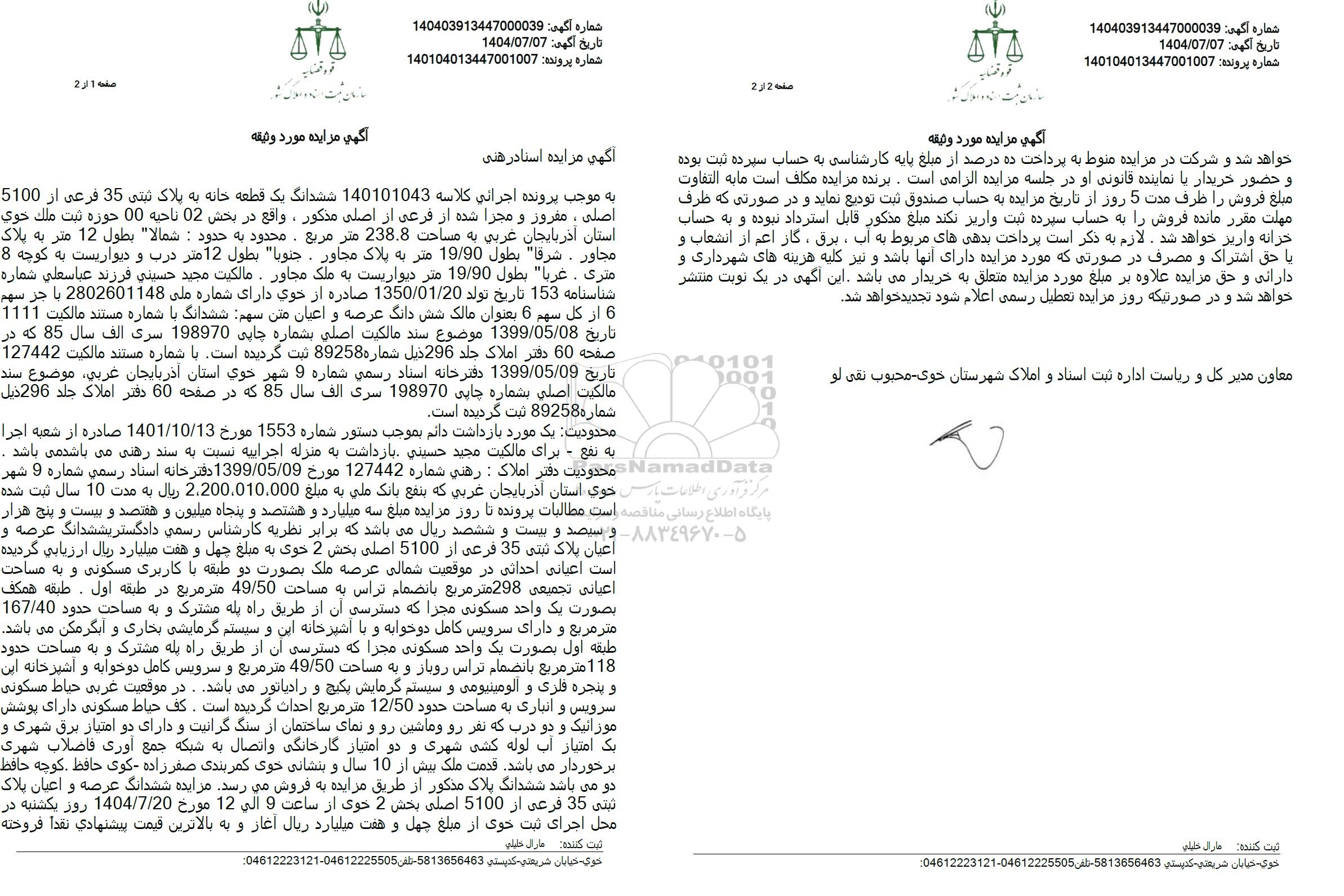 به موجب پرونده اجرائی کلاسه 140101043 ششدانگ یک قطعه خانه به پلاک ثبتی 35 فرعی از 5100 اصلی، مغرور و مجرا شده از فرعی از اصلی مذکور، واقع در بخش 02 ناحیه 00 حوزه ثبت ملک خوی استان آذربایجان غربی به مساحت 238.8 متر مربع محدود به حدود : شمالا" بطول 12 متر به پلاک مجاور - شرقا بطول 19.90 متر به پلاک مجاور ، جنوبا" بطول 12 متر درب و دیواریست به کوچه 8 مترى . غربا" بطول 19.90 متر دیواریست به ملک مجاور، مالکیت مجید حسینی فرزند عباسعلی شماره شناسنامه 153 تاریخ تولد 1350.01.20 صادره از خوی دارای شماره ملی 2802601148 با جز سهم در 6 از کل سهم 6 بعنوان مالک شش دانگ عرصه و اعیان متن سهم ششدانگ با شماره مستند مالکیت 1111 تاریخ 1399.05.08 موضوع سند مالکیت اصلی بشماره چایی 198970 سری الف سال 85 که در صفحه 60 دفتر املاک جلد 296 ذیل شماره 89258 ثبت گردیده است. با شماره مستند مالکیت 127442 تاریخ 1399.05.09 دفترخانه اسناد رسمی شماره 9 شهر خوی استان آذربایجان غربی موضوع سند مالکیت اصلی بشماره چاپی 198970 سری الف سال 85 که در صفحه 60 دفتر املاک جلد 296 ذیل شماره 89258 ثبت گردیده است.