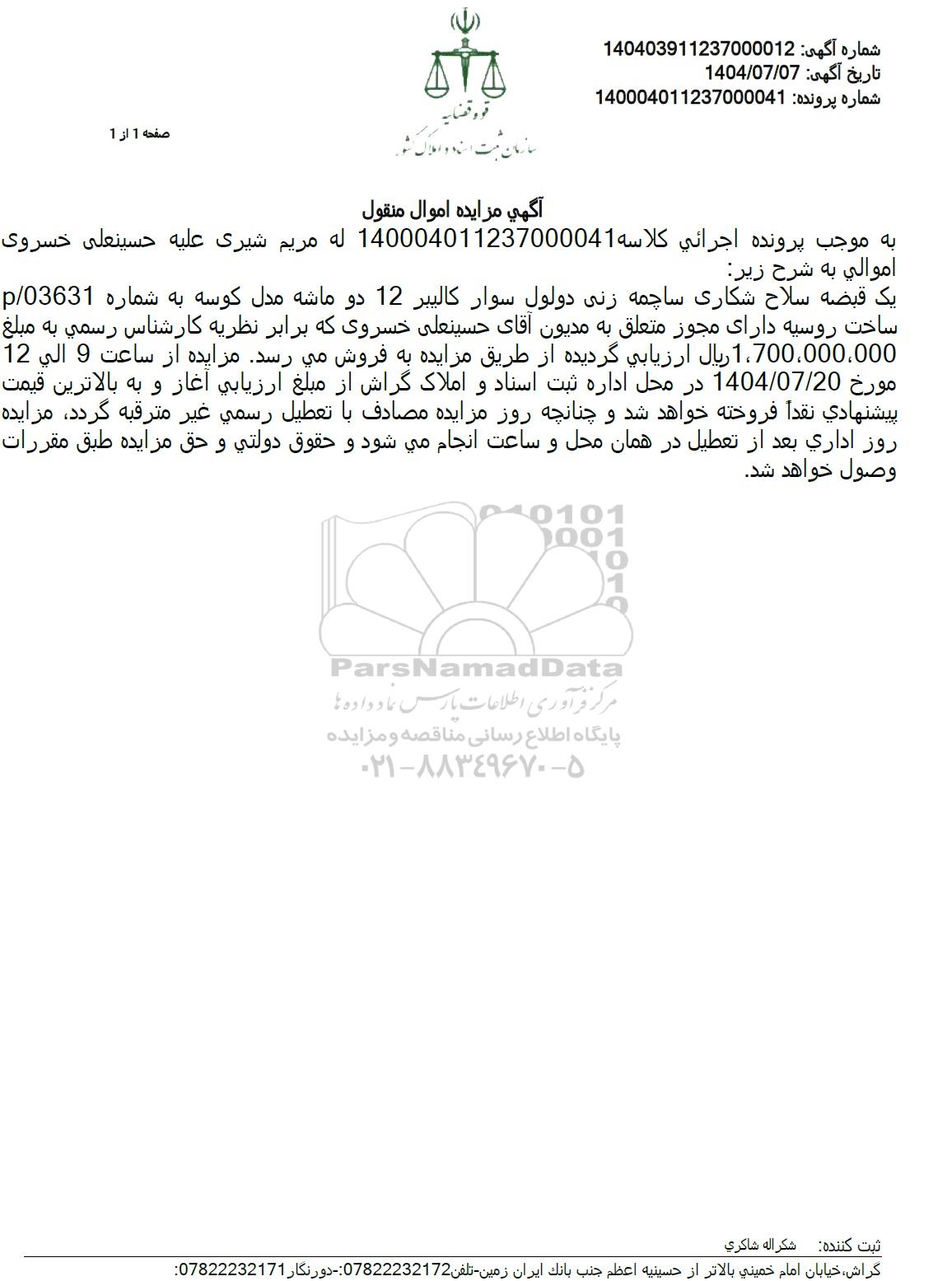 یک قبضه سلاح شکاری ساچمه زنی دولول سوار کالیبر 12 دو ماشه مدل کوسه به شماره 03631/p ساخت روسیه دارای مجوز متعلق به مدیون آقای حسینعلی خسروی که برابر نظریه کارشناس رسمی به مبلغ 1.700.000.000 ريال ارزیابی گردیده از طریق مزایده به فروش می رسد. مزایده از ساعت 9 الی 12 مورخ 1404.07.20 در محل اداره ثبت اسناد و املاک گراش از مبلغ ارزیابی آغاز و به بالاترین قیمت پیشنهادي نقدا فروخته خواهد شد و چنانچه روز مزایده مصادف با تعطیل رسمي غير مترقبه گردد. مزایده روز اداری بعد از تعطیل در همان محل و ساعت انجام میشود و حقوق دولتي و حق مزایده طبق مقررات وصول خواهد شد.