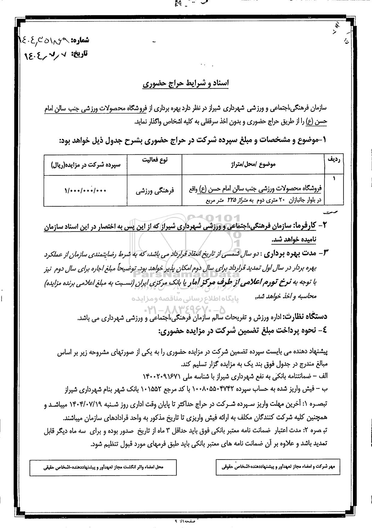 مزایده عمومی حراج حضوری واگذاری فروشگاه محصولات ورزشی جنب سالن امام حسن (ع) برگزار میگردد. از کلیه افراد متخصص و شرکتهای واجد شرایط دعوت به عمل میآید تا در این مزایده با کد خبرگزاری پارس نماد : 9625775 شرکت نمایند تاریخ شروع مزایده : 1404/07/08 مهلت شرکت در مزایده: تا پایان روز 1404/07/19 مکان برگزاری اموال واگذاری استانهای فارس و دستهبندیهای مربوط به این حراجی واگذاری ورزشگاه، پارکینگ، غرفه و بوفه میباشد.