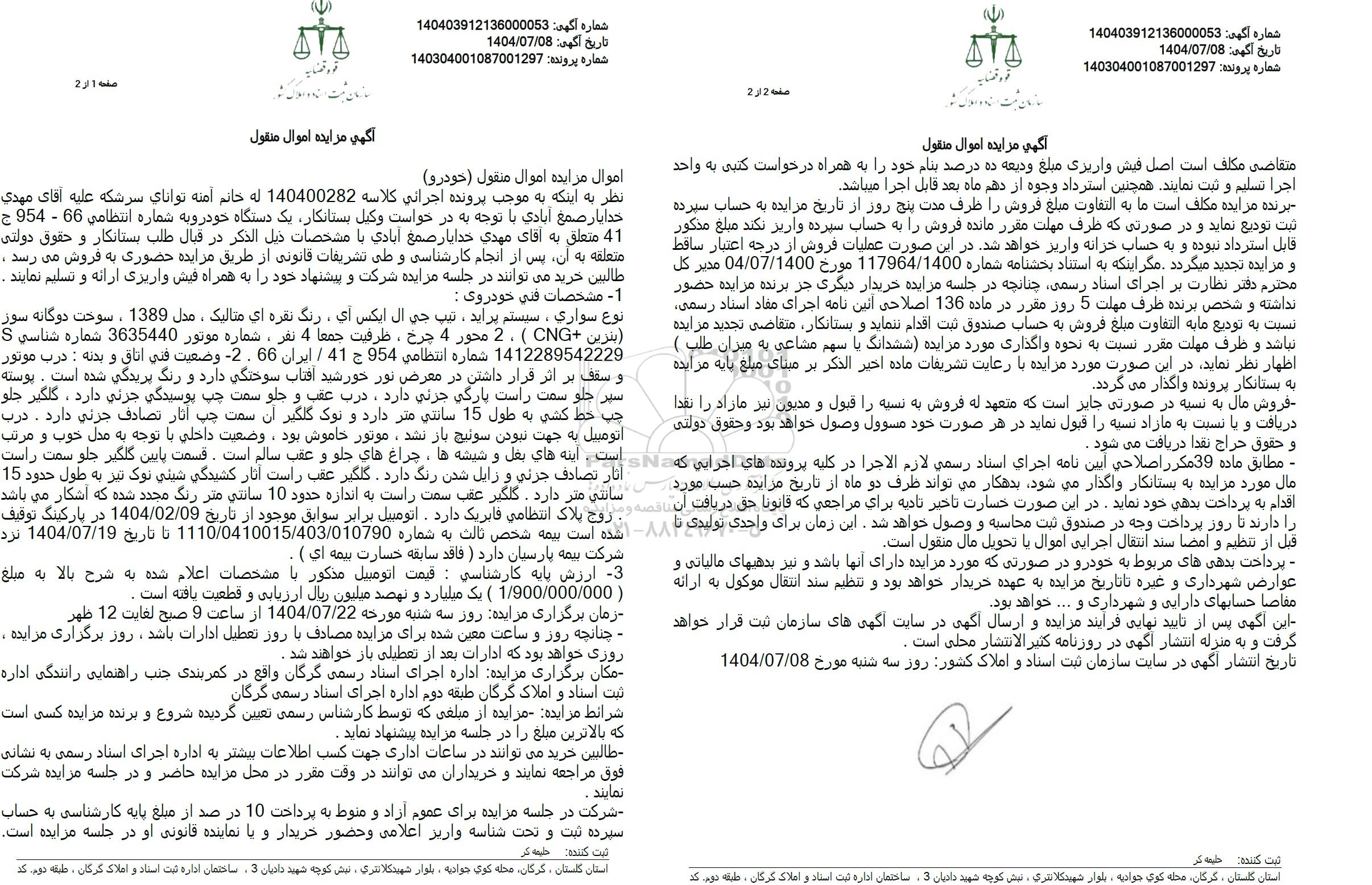 نظر به اینکه به موجب پرونده اجرائی کلاسه 140400282 له خانم آمنه توانای سرشکه علیه آقای مهدی خدایار صمغ آبادی با توجه به در خواست وکیل بستانکار یک دستگاه خودرویه شماره انتظامی 66 - 954 ج 41 متعلق به آقای مهدی خدایار صمغ آبادی با مشخصات ذیل الذکر در قبال طلب بستانکار و حقوق دولتی متعلقه به آن پس از انجام کارشناسی و طی تشریفات قانونی از طریق مزایده حضوری به فروش می رسد . طالبین خرید میتوانند در جلسه مزایده شرکت و پیشنهاد خود را به همراه فیش واریزی ارائه و تسلیم نمایند . -1- مشخصات فنی خودروی :