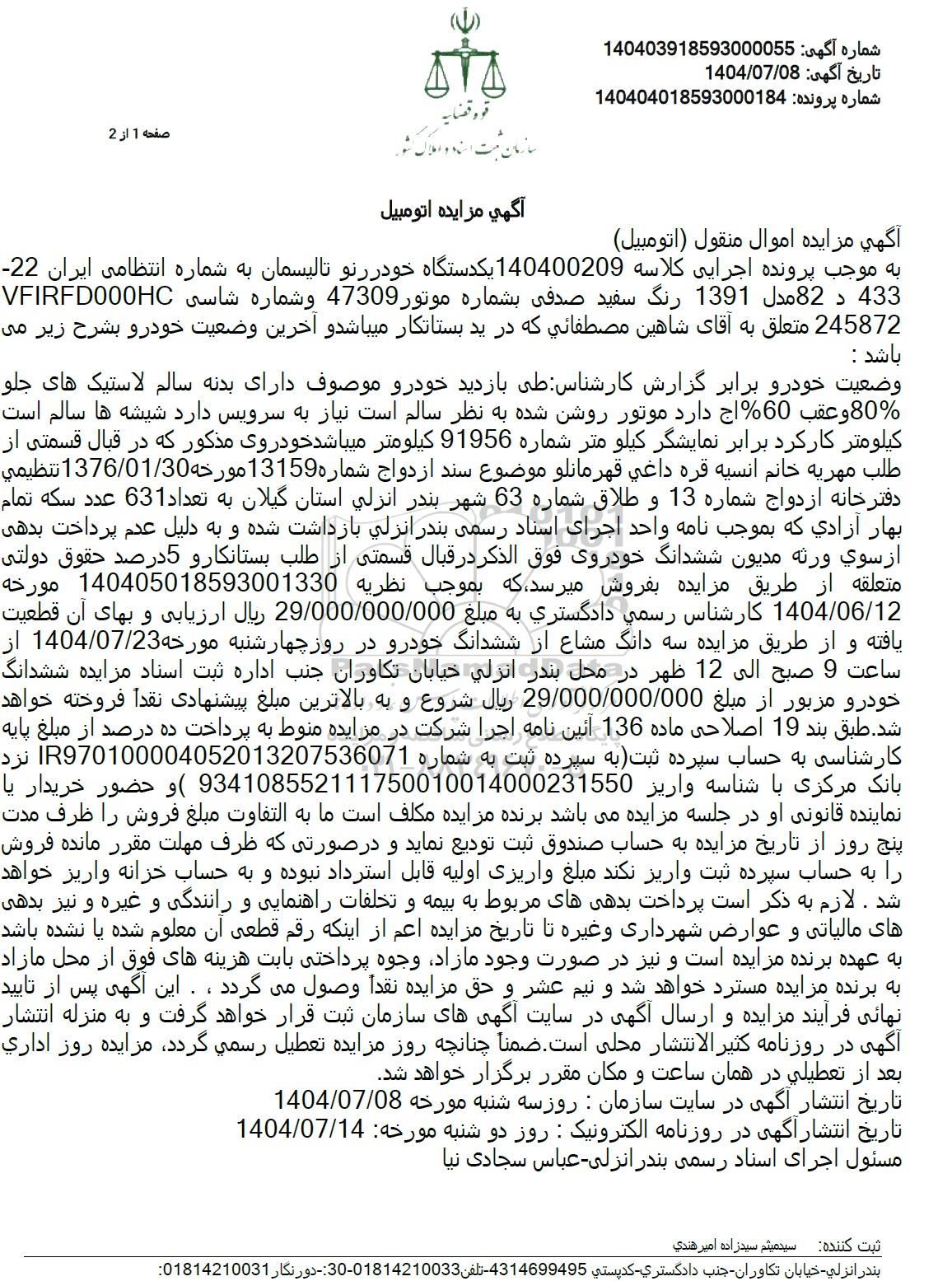 وضعیت خودرو برابر گزارش کارشناس طی بازدید خودرو موصوف دارای بدنه سالم لاستیک های جلو 80 و عقب 60 ج دارد موتور روشن شده به نظر سالم است نیاز به سرویس دارد شیشه ها سالم است. کیلومتر کارکرد برابر نمایشگر کیلو متر شماره 91956 کیلومتر میباشد خودروی مذکور که در قبال قسمتی از طلب مهریه خانم انسیه قره داغي قهرمانلو موضوع سند ازدواج شماره 13159 مورخه 1376.01.30 تنظيمي دفتر خانه ازدواج شماره 13 و طلاق شماره 63 شهر بندر انزلي استان گیلان به تعداد 631 عدد سکه تمام بهار آزادي که بموجب نامه واحد اجرای اسناد رسمی بندر انزلی بازداشت شده و به دلیل عدم پرداخت بدهی از سوي ورثه مدیون ششدانگ خودروی فوق الذکر در قبال قسمتی از طلب بستانکار و 5 درصد حقوق دولتی متعلقه از طریق مزایده بفروش میرسد که بموجب نظریه 140405018593001330 مورخه 1404.06.12 کارشناس رسمی دادگستري به مبلغ 29.000.000.000 ریال ارزیابی و بهای آن قطعیت یافته و از طریق مزایده سه دانگ مشاع از ششدانگ خودرو در روز چهارشنبه مورخه 1404.07.23 از ساعت 9 صبح الى 12 ظهر در محل بندر انزلی خیابان تکاوران جنب اداره ثبت اسناد مزایده ششدانگ خودرو مزبور از مبلغ 29.000.000.000 ریال شروع و به بالاترین مبلغ پیشنهادی نقدا فروخته خواهد شد. طبق بند 19 اصلاحی ماده 136 آئین نامه اجرا شرکت در مزایده منوط به پرداخت ده درصد از مبلغ پایه کارشناسی به حساب سپرده ثبت به سپرده ثبت به شماره IR970100004052013207536071 نزد بانک مرکزی با شناسه واریز 934108552111750010014000231550 و حضور خریدار یا نماینده قانونی او در جلسه مزایده میباشد برنده مزایده مکلف است ما به التفاوت مبلغ فروش را ظرف مدت پنج روز از تاریخ مزایده به حساب صندوق ثبت تودیع نماید و در صورتی که ظرف مهلت مقرر مانده فروش را به حساب سپرده ثبت واریز نکند مبلغ واریزی اولیه قابل استرداد نبوده و به حساب خزانه واریز خواهد شد . لازم به ذکر است پرداخت بدهیهای مربوط به بیمه و تخلفات راهنمایی و رانندگی و غیره و نیز بدهی های مالیاتی و عوارض شهرداری و غیره تا تاریخ مزایده اعم از اینکه رقم قطعی آن معلوم شده یا نشده باشد به عهده برنده مزایده است و نیز در صورت وجود مازاد وجوه پرداختی بابت هزینه های فوق از محل مازاد به برنده مزایده مسترد خواهد شد و نیم عشر و حق مزایده نقداً وصول میگردد . . این آگهی پس از تایید نهایی فرآیند مزایده و ارسال آگهی در سایت آگهی های سازمان ثبت قرار خواهد گرفت و به منزله انتشار آگهی در روزنامه کثیر الانتشار محلی است. ضمناً چنانچه روز مزایده تعطیل رسمی گردد، مزایده روز اداری بعد از تعطیلی در همان ساعت و مکان مقرر برگزار خواهد شد.