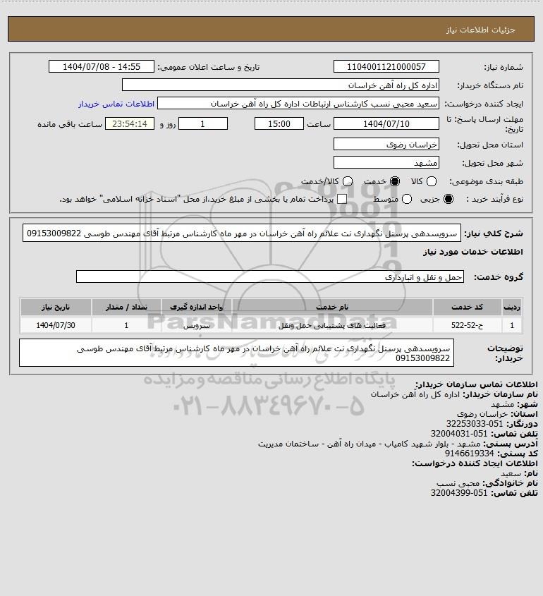 توضیحات خریدار:سرویسدهی پرسنل نگهداری نت علائم راه آهن خراسان در مهر ماه کارشناس مرتبط آقای مهندس طوسی 09153009822