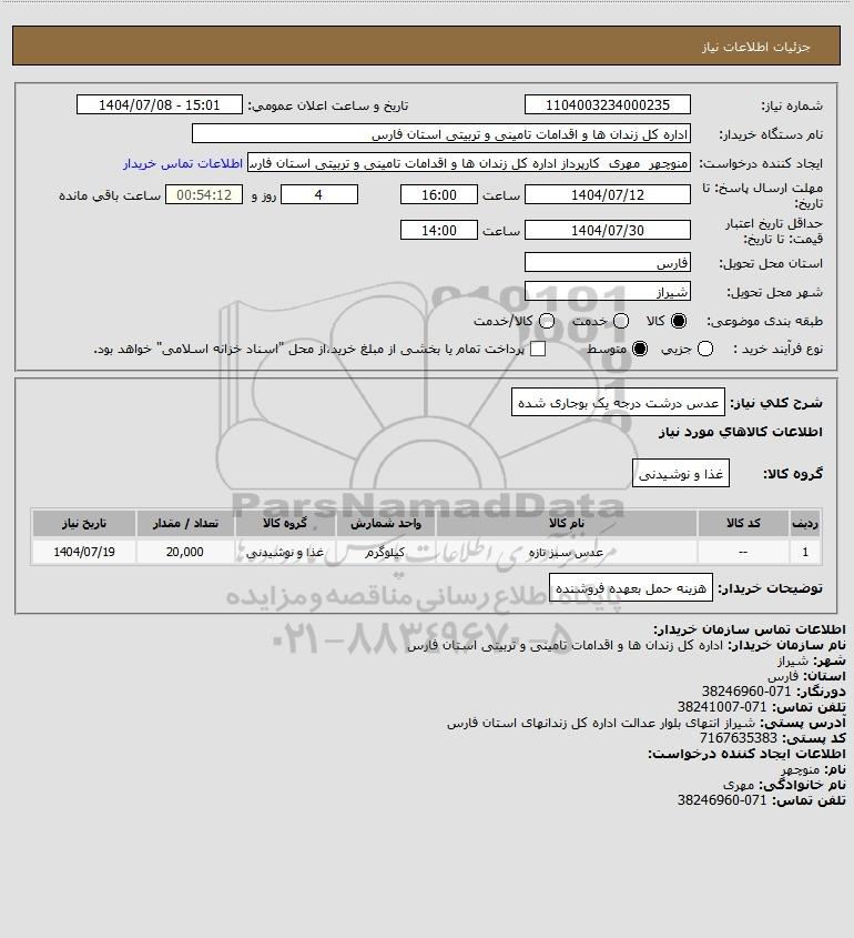 | 1 | -- | عدس سبز تازه | کیلوگرم | غذا و نوشیدنی | 20,000 | 1404/07/19 |