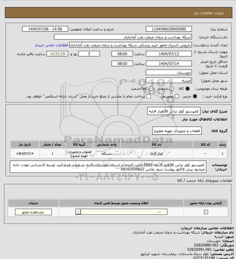 شرح کلی نیاز: کمپرسور کولر تراس 36هزار 4پایه