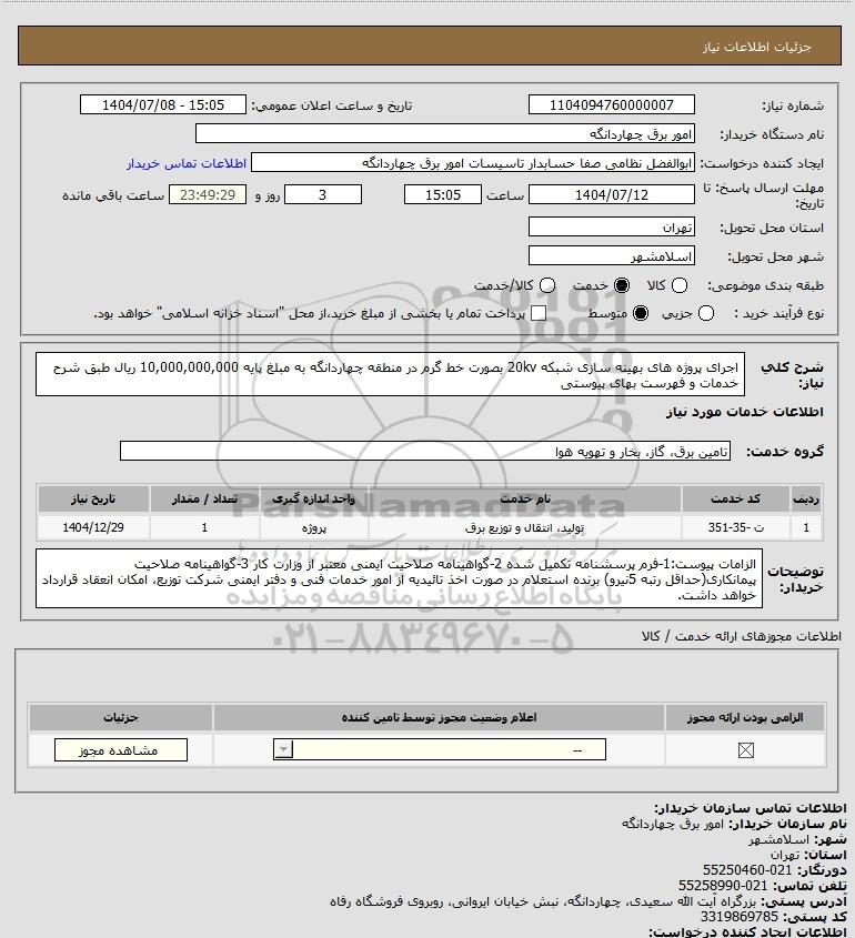 شرح کلی نیاز: اجرای پروژه های بهینه سازی شبکه 20kv بصورت خط گرم در منطقه چهاردانگه به مبلغ پایه 10,000,000,000 ریال طبق شرح خدمات و فهرست بهای پیوستی