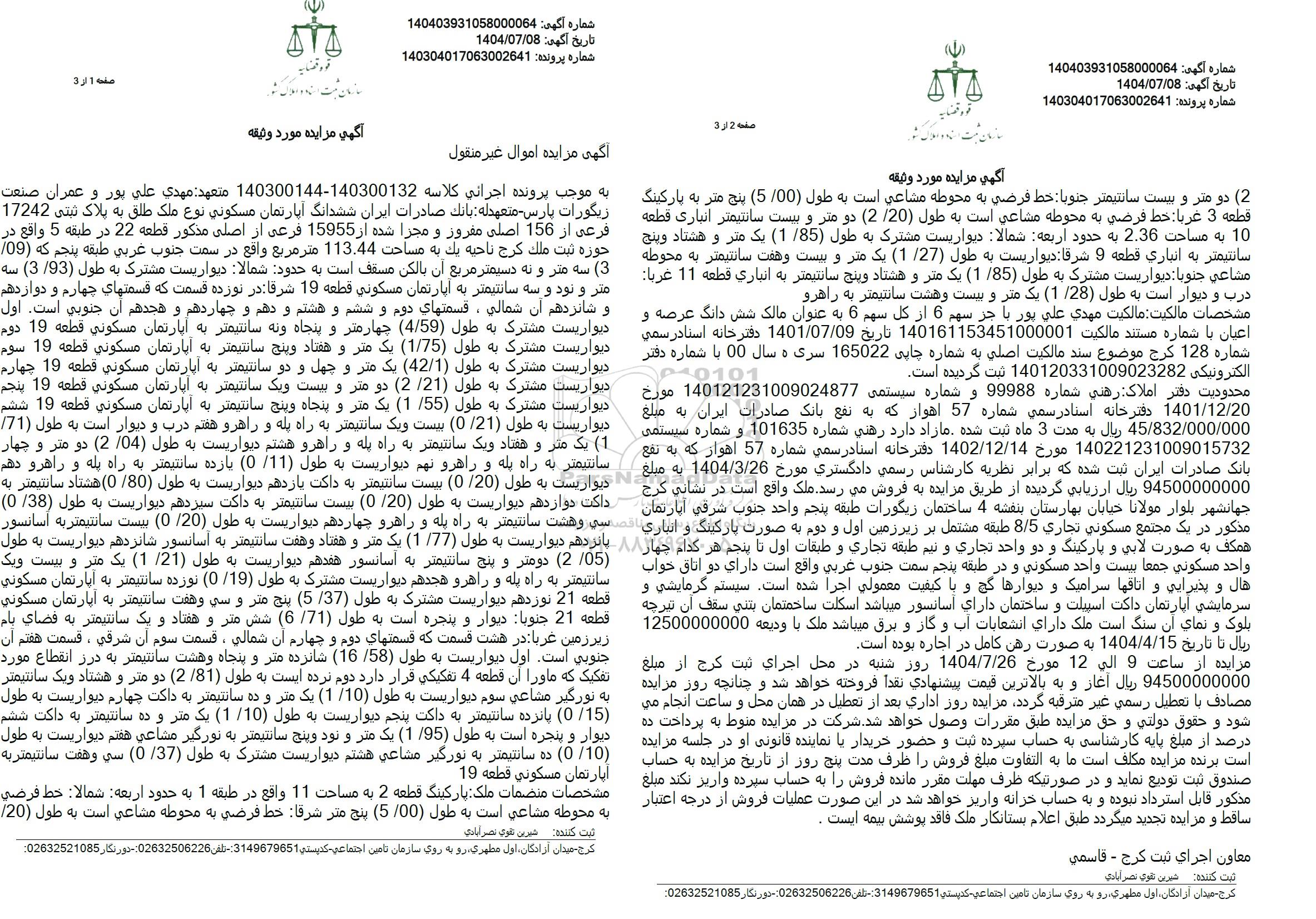 به موجب پرونده اجرائی کلاسه 140300132-140300144 متعهد مهدی علی پور و عمران صنعت زیگورات پارس متعهدله : بانک صادرات ایران ششدانگ آپارتمان مسکونی نوع ملک طلق به پلاک ثبتی 17242 فرعی از 156 اصلی مفروز و مجزا شده از 15955 فرعی از اصلی مذکور قطعه 22 در طبقه 5 واقع در حوزه ثبت ملک کرج ناحیه یک به مساحت 113.44 متر مربع واقع در سمت جنوب غربی طبقه پنجم که (3.09) سه متر و نه دسیمتر مربع آن بالکن مسقف است