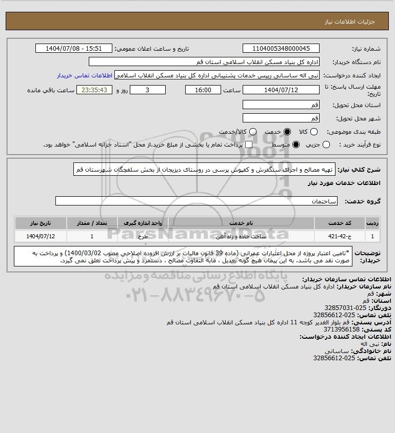 نام دستگاه خریدار:اداره کل بنیاد مسکن انقلاب اسلامی استان قم