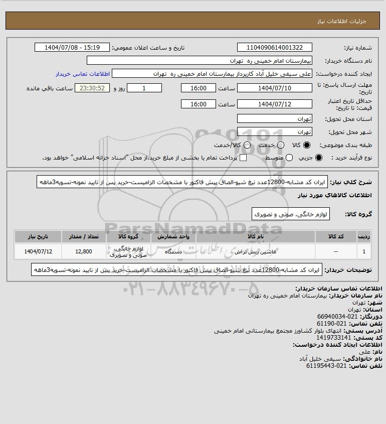 شرح کلی نیاز: ایران کد مشابه-12800عدد تیغ شیو-الصاق پیش فاکتور با مشخصات الزامیست-خرید پس از تایید نمونه-تسویه3ماهه