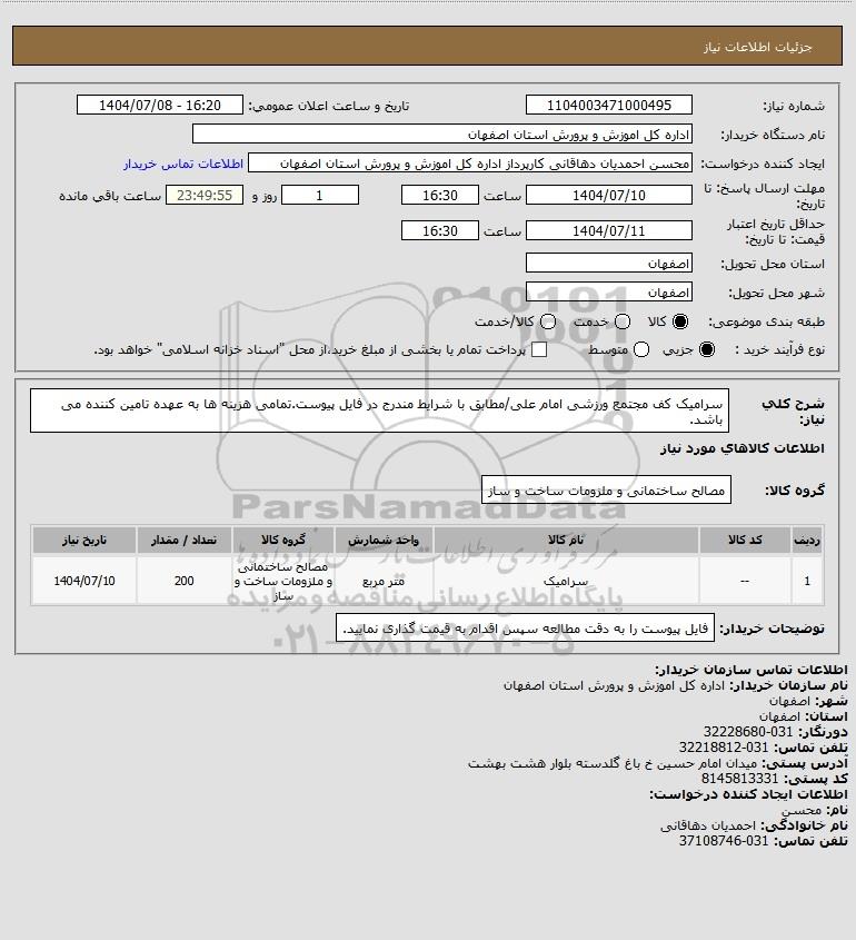 شرح کلی نیاز: سرامیک کف مجتمع ورزشی امام علی/مطابق با شرایط مندرج در فایل پیوست.تمامی هزینه ها به عهده تامین کننده می باشد.