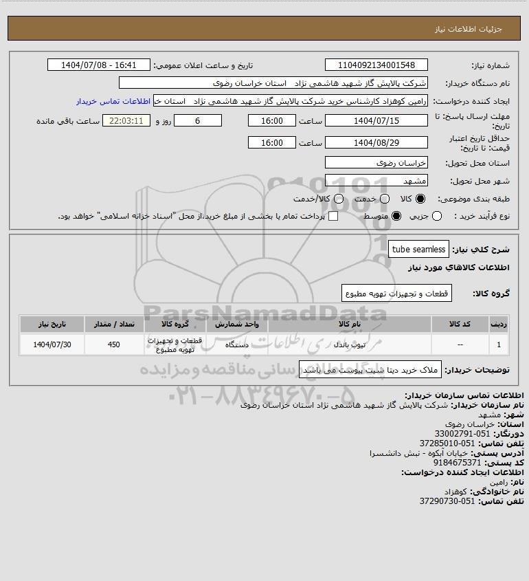 شرح کلی نیاز: tube seamless