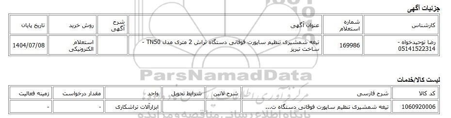 رضا توحیدخواه - 05141522314169986تیغه شمشیری تنظیم ساپورت فوقانی دستگاه تراش 2 متری مدل TN50 - ساخت تبریزاستعلام الکترونیکی1404/07/08