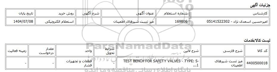 امیرحسین اسعدی نژاد - 05141522302169806میز تست شیرهای اطمیناناستعلام الکترونیکی1404/07/08