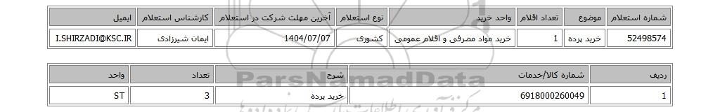 52498574 | خرید پرده | 1 | خرید مواد مصرفی و اقلام عمومی | کشوری | 1404/07/07 | ایمان شیرزادی | I.SHIRZADI@KSC.IR |