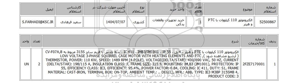 52500867 | الکتروموتور 110 کیلووات با PTC و هیتر | 1 | خرید تجهیزات وقطعات یدکی | کشوری | 1404/07/07 | سعید فرهادی | S.FARHADI@KSC.IR |