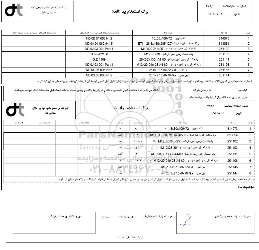 مهلت اعتبار استعلام تا تاریخ 1404.07.12 می باشد. در پاکت (الف) قرار داده شود.