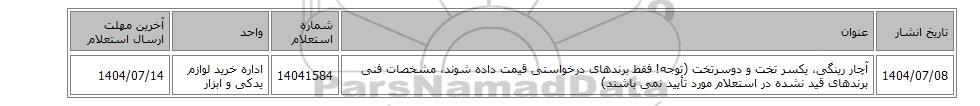 | 1404/07/08 | آچار رینگی، یکسر تخت و دوسرتخت (توجه! فقط برندهای درخواستی قیمت داده شوند، مشخصات فنی برندهای قید نشده در استعلام مورد تأیید نمی باشند) | 14041584 | اداره خرید لوازم یدکی و ابزار | 1404/07/14 |