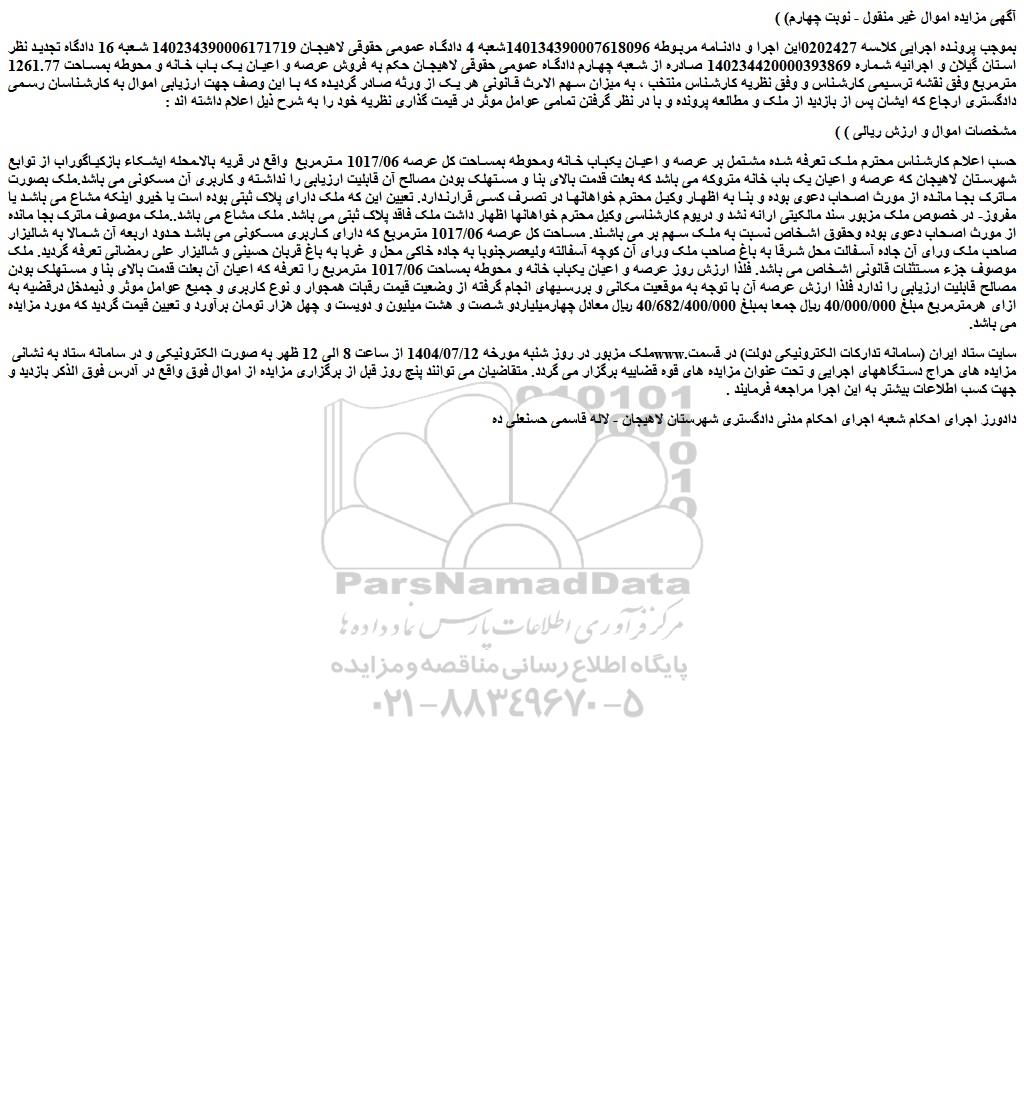 حسب اعلام کارشناس محترم ملک تعرفه شده مشتمل بر عرصه و اعیان یکباب خانه ومحوطه بمساحت کل عرصه 1017/06 مترمربع  واقع در قریه بالامحله ایشکاء بازکیاگوراب از توابع شهرستان لاهیجان که عرصه و اعیان یک باب خانه متروکه می باشد که بعلت قدمت بالای بنا و مستهلک بودن مصالح آن قابلیت ارزیابی را نداشته و کاربری آن مسکونی می باشد.ملک بصورت ماترک بجا مانده از مورث اصحاب دعوی بوده و بنا به اظهار وکیل محترم خواهانها در تصرف کسی قرارندارد. تعیین این که ملک دارای پلاک ثبتی بوده است یا خیرو اینکه مشاع می باشد یا مفروز- در خصوص ملک مزبور سند مالکیتی ارائه نشد و دریوم کارشناسی وکیل محترم خواهانها اظهار داشت ملک فاقد پلاک ثبتی می باشد. ملک مشاع می باشد..ملک موصوف ماترک بجا مانده از مورث اصحاب دعوی بوده وحقوق اشخاص نسبت به ملک سهم بر می باشند. مساحت کل عرصه 1017/06 مترمربع که دارای کاربری مسکونی می باشد حدود اربعه آن شمالا به شالیزار صاحب ملک ورای آن جاده آسفالت محل شرقا به باغ صاحب ملک ورای آن کوچه آسفالته ولیعصرجنوبا به جاده خاکی محل و غربا به باغ قربان حسینی و شالیزار علی رمضانی تعرفه گردید. ملک موصوف جزء مستثنات قانونی اشخاص می باشد. فلذا ارزش روز عرصه و اعیان یکباب خانه و محوطه بمساحت 1017/06 مترمربع را تعرفه که اعیان آن بعلت قدمت بالای بنا و مستهلک بودن مصالح قابلیت ارزیابی را ندارد فلذا ارزش عرصه آن با توجه به موقعیت مکانی و بررسیهای انجام گرفته از وضعیت قیمت رقبات همجوار و نوع کاربری و جمیع عوامل موثر و ذیمدخل درقضیه به ازای هرمترمربع مبلغ 40/000/000 ریال جمعا بمبلغ 40/682/400/000 ریال معادل چهارمیلیاردو شصت و هشت میلیون و دویست و چهل هزار تومان برآورد و تعیین قیمت گردید که مورد مزایده می باشد.