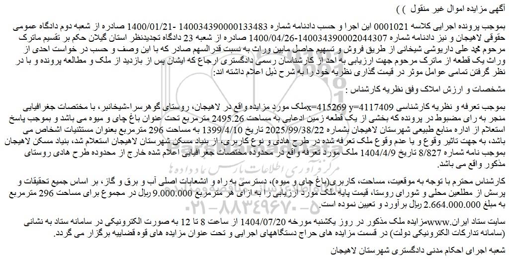 بموجب پرونده اجرایی کلاسه 0001021 این اجرا و حسب دادنامه شماره 140034390000133483 -1400/01/21 صادره از شعبه دوم دادگاه عمومی حقوقی لاهیجان و نیز دادنامه شماره 140034390002044307-1400/04/26 صادره از شعبه 23 دادگاه تجدیدنظر استان گیلان حکم بر تقسیم ماترک مرحوم محمد علی داریوشی شیخانی از طریق فروش و تسهیم حاصل مابین وراث به نسبت قدرالسهم صادر که با این وصف و حسب در خواست احدی از وراث یک قطعه از ماترک مرحوم جهت ارزیابی به احد از کارشناسان رسمی دادگستری ارجاع که ایشان پس از بازدید از ملک و مطالعه پرونده و با در نظر گرفتن تمامی عوامل موثر در قیمت گذاری نظریه خود را به شرح ذیل اعلام داشته اند: