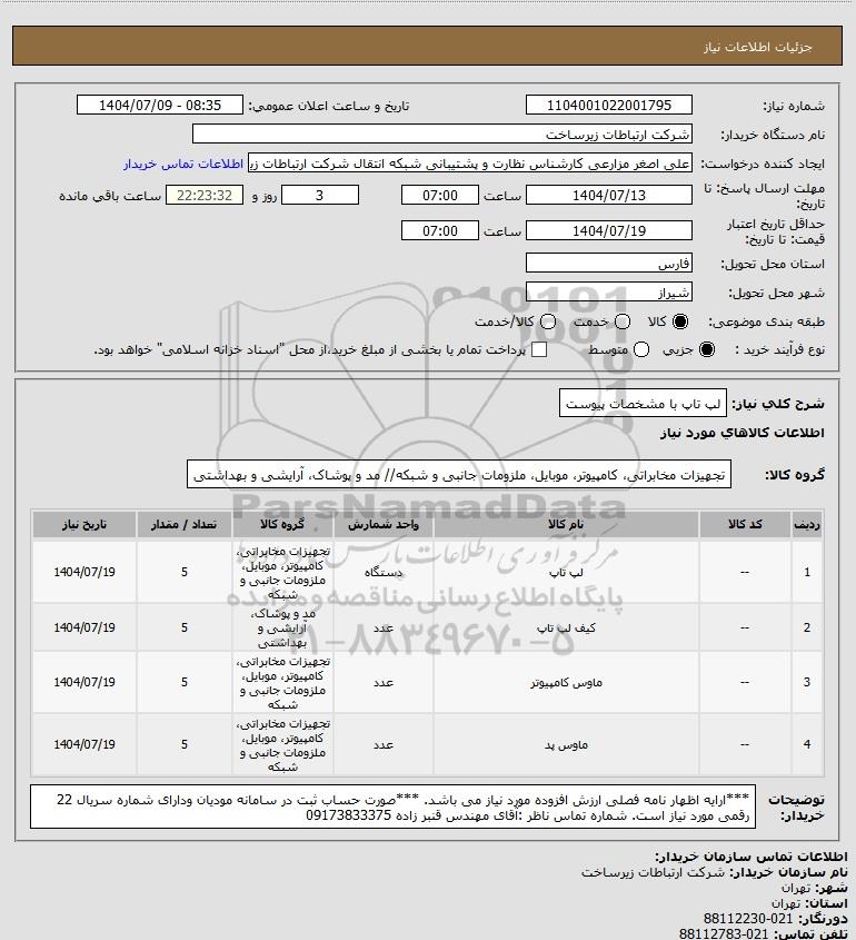 | 1 | -- | لپ تاپ | دستگاه | تجهیزات مخابراتی، کامپیوتر، موبایل، ملزومات جانبی و شبکه | 5 | 1404/07/19 |