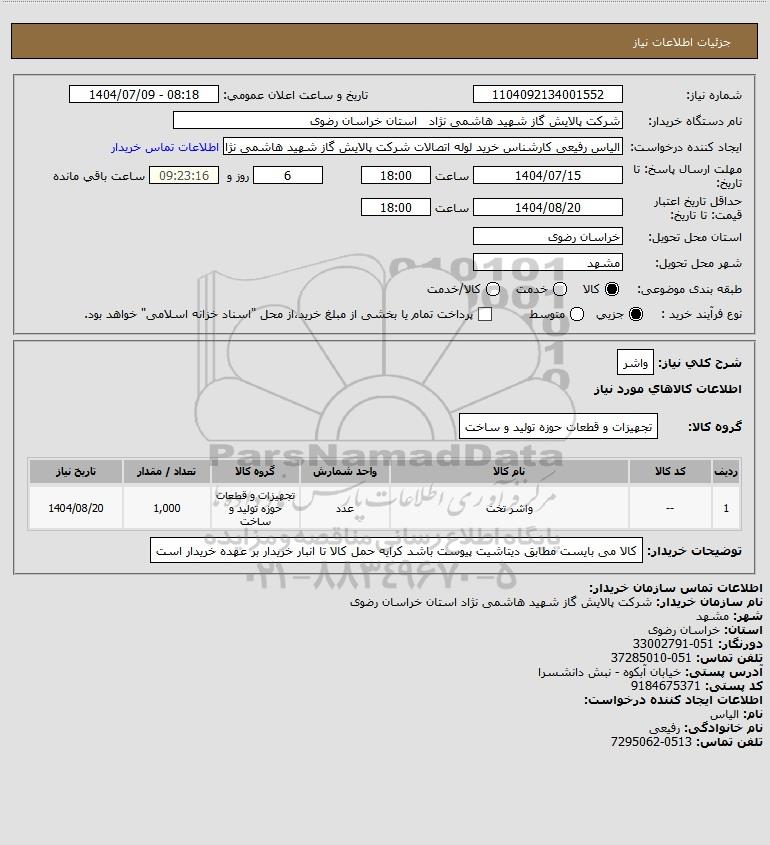 نام دستگاه خریدار:شرکت پالایش گاز شهید هاشمی نژاد استان خراسان رضوی