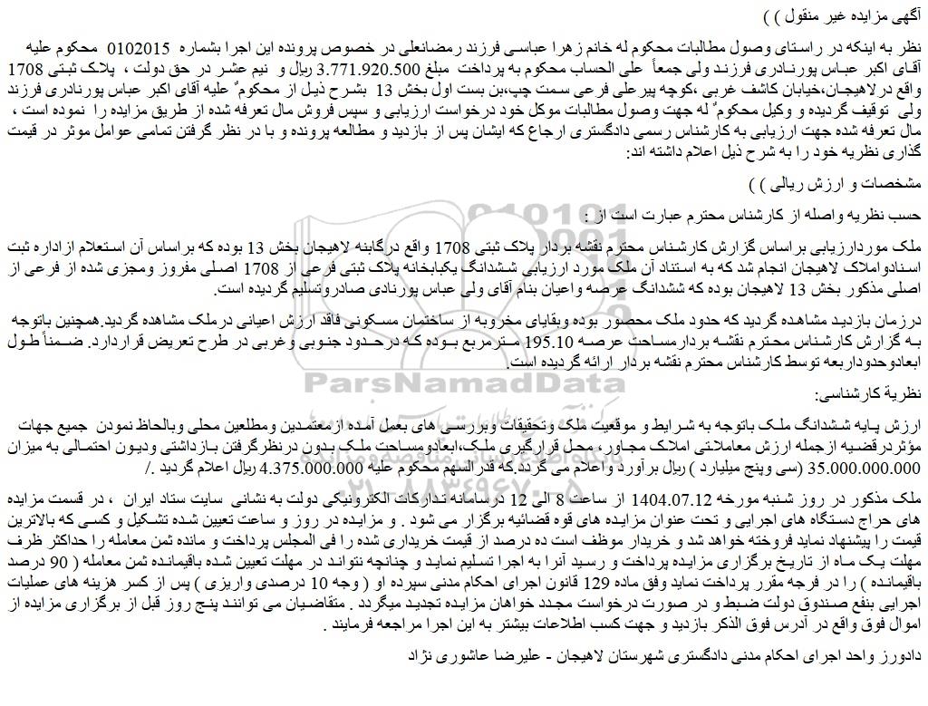 نظر به اینکه در راستای وصول مطالبات محکوم له خانم زهرا عباسی فرزند رمضانعلی در خصوص پرونده این اجرا بشماره 0102015 محکوم علیه آقای اکبر عباس پورنادری فرزند ولی جمعاً علی الحساب محکوم به پرداخت مبلغ 3.771.920.500 ریال و نیم عشر در حق دولت ، پلاک ثبتی 1708 واقع درلاهیجان،خیابان کاشف غربی ،کوچه پیرعلی فرعی سمت چپ،بن بست اول بخش 13 بشرح ذیل از محکوم ٌ علیه آقای اکبر عباس پورنادری فرزند ولی توقیف گردیده و وکیل محکوم ٌ له جهت وصول مطالبات موکل خود درخواست ارزیابی و سپس فروش مال تعرفه شده از طریق مزایده را نموده است ، مال تعرفه شده جهت ارزیابی به کارشناس رسمی دادگستری ارجاع که ایشان پس از بازدید و مطالعه پرونده و با در نظر گرفتن تمامی عوامل موثر در قیمت گذاری نظریه خود را به شرح ذیل اعلام داشته اند: