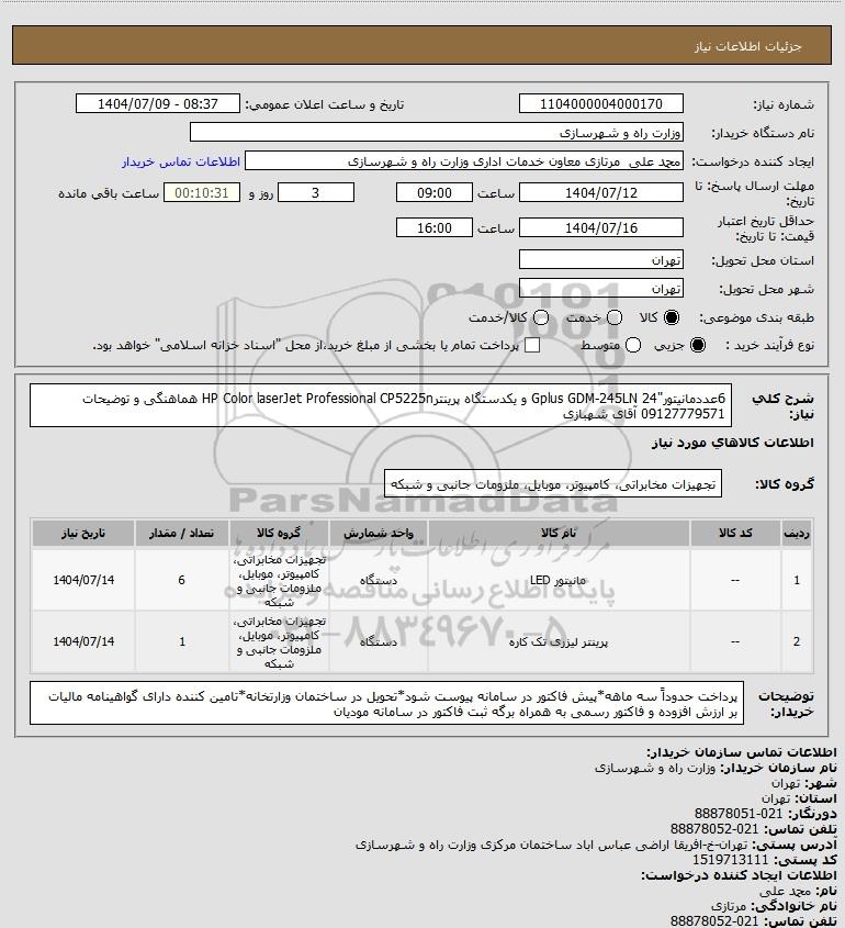 شرح کلی نیاز: 6عددمانیتور"Gplus GDM-245LN 24 و یکدستگاه پرینترHP Color laserJet Professional CP5225n هماهنگی و توضیحات 09127779571 آقای شهبازی