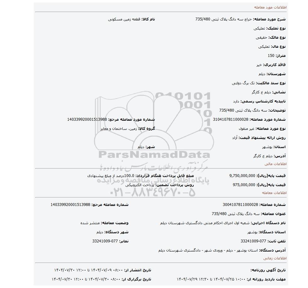 | شرح مورد معامله: حراج سه دانگ پلاک ثبتی 735/480 | نام کالا: قطعه زمین مسکونی | |