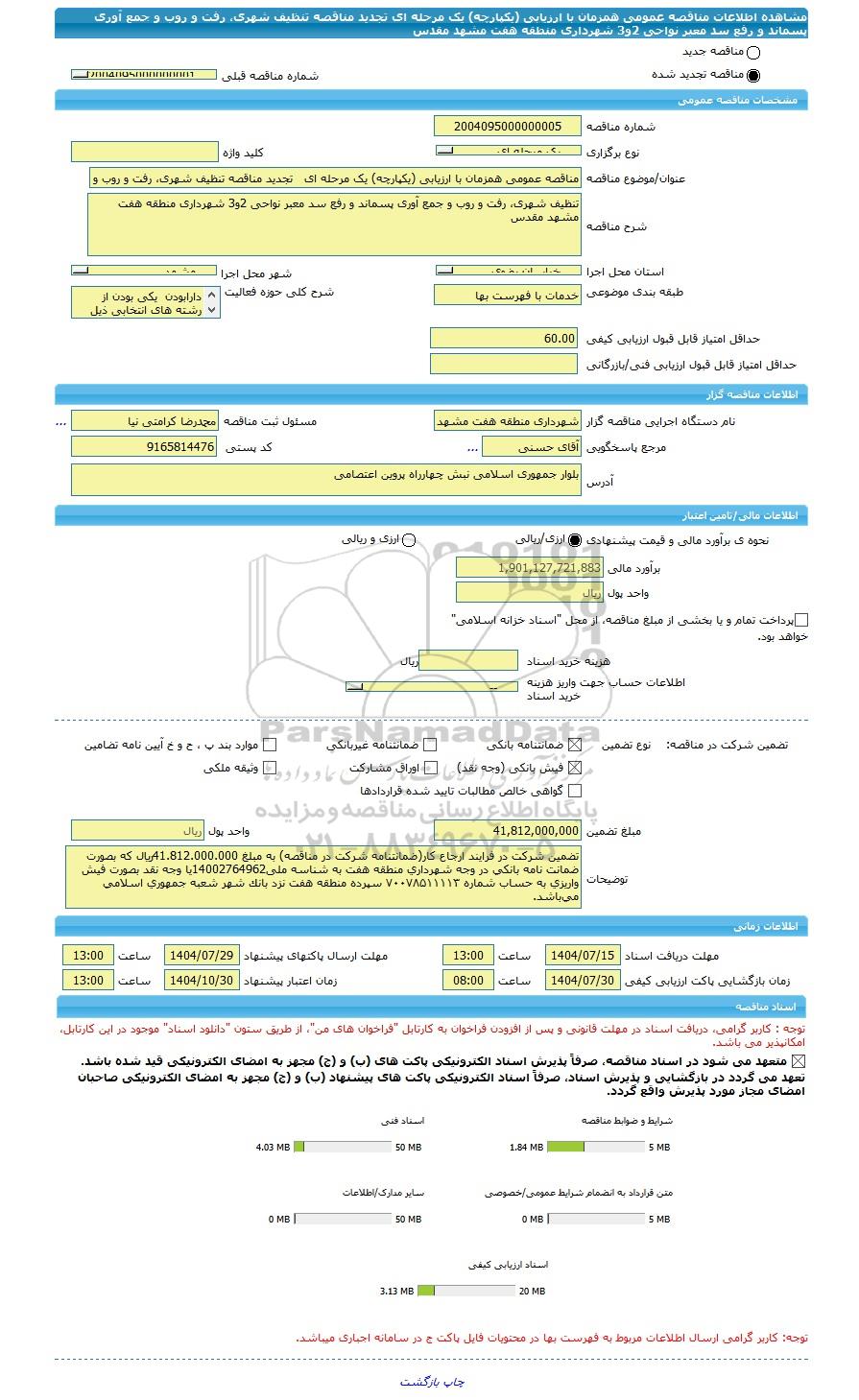 | نام دستگاه اجرایی مناقصه گزار | شهرداری منطقه هفت مشهد استان خراسان رضوی | مسئول ثبت مناقصه | محمدرضا کرامتی نیا |