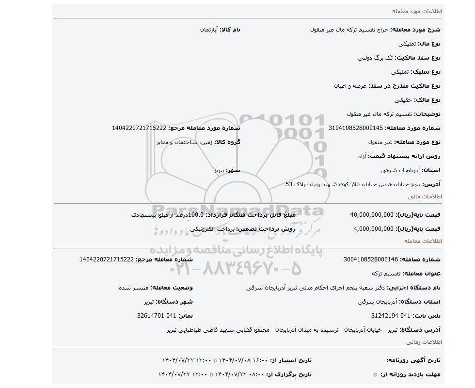 شرح مورد معامله: حراج تقسیم ترکه مال غیر منقولنام کالا: آپارتمان