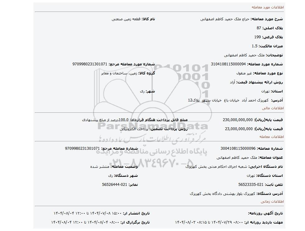 | قیمت پایه(ریال): 23,000,000,000 | روش پرداخت تضمین: پرداخت الکترونیکی |