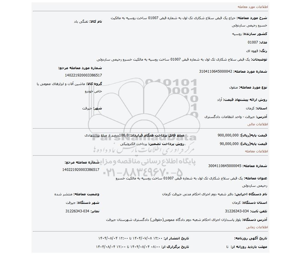 | عنوان معامله: یک قبض سلاح شکاری تک لول به شماره قبض 01007 ساخت روسیه به مالکیت خسرو رحیمی ساردوئی | ||