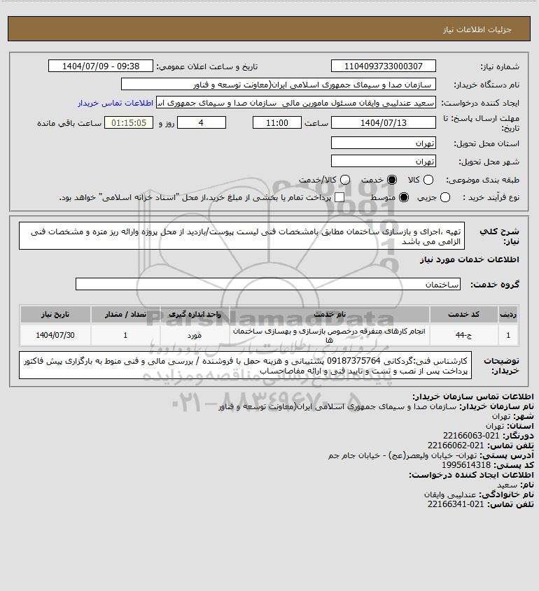 شرح کلی نیاز: تهیه ،اجرای و بازسازی ساختمان مطابق بامشخصات فنی لیست پیوست/بازدید از محل پروژه وارائه ریز متره و مشخصات فنی الزامی می باشد