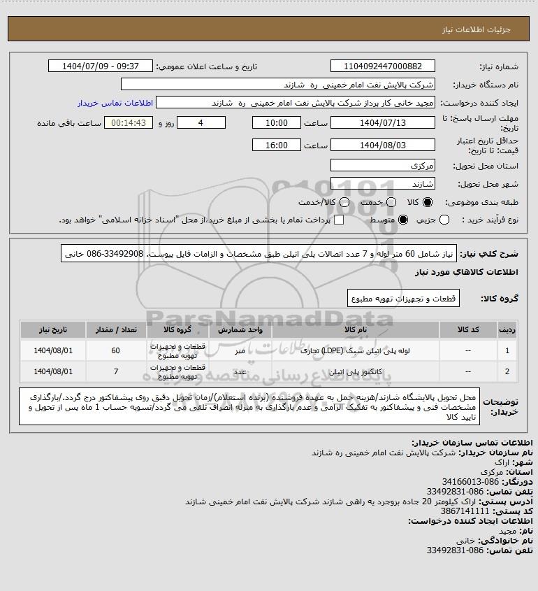 شرح کلی نیاز: نیاز شامل 60 متر لوله و 7 عدد اتصالات پلی اتیلن طبق مشخصات و الزامات فایل پیوست. 33492908-086 خانی