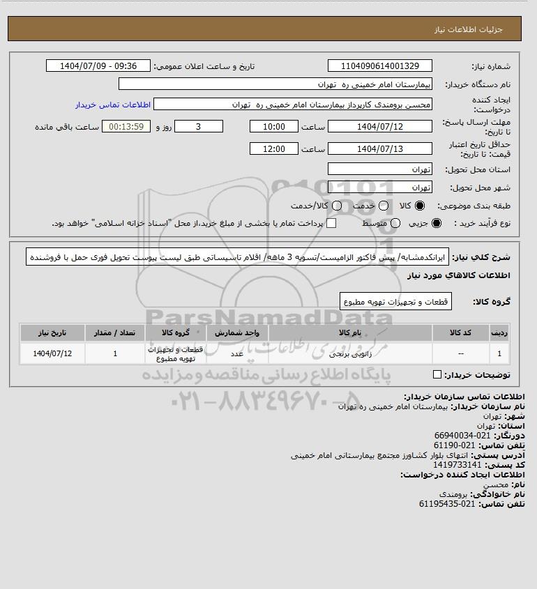 استعلام ایرانکدمشابه/ پیش فاکتور الزامیست/تسویه 3 ماهه/ اقلام تاسیساتی طبق لیست پیوست تحویل فوری حمل با فروشنده, استعلام ایرانکدمشابه/ پیش فاکتور الزامیست/تسویه 3 ماهه/ اقلام تاسیساتی طبق لیست پیوست تحویل فوری حمل با فروشنده
