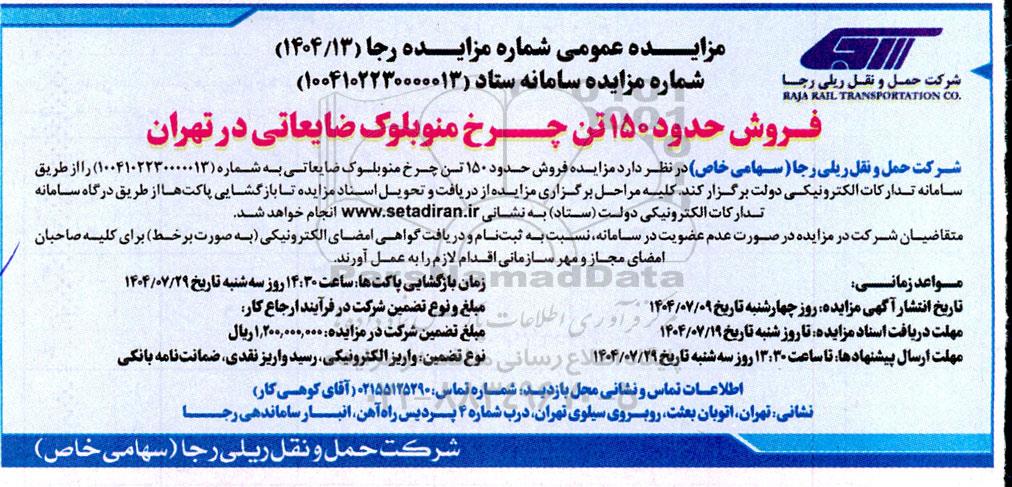 شرکت حمل و نقل ریلی رجا (سهامی خاص) در نظر دارد فروش حدود 150 تن چرخ منوبلوک ضایعاتی به شماره (1004102230000013) را از طریق سامانه تدارکات الکترونیکی دولت برگزار کند. کلیه مراحل برگزاری مزایده از دریافت و تحویل اسناد مزایده تا بازگشایی پاکت ها از طریق درگاه سامانه تدارکات الکترونیکی دولت (ستاد) به آدرس ستاد ایران انجام خواهد شد. متقاضیان شرکت در مزایده در صورت عدم عضویت در سامانه نسبت به ثبت نام و دریافت گواهی امضای الکترونیکی (به صورت برخط) برای کلیه صاحبان امضای مجاز و مهر سازمانی اقدام لازم را به عمل آورند.