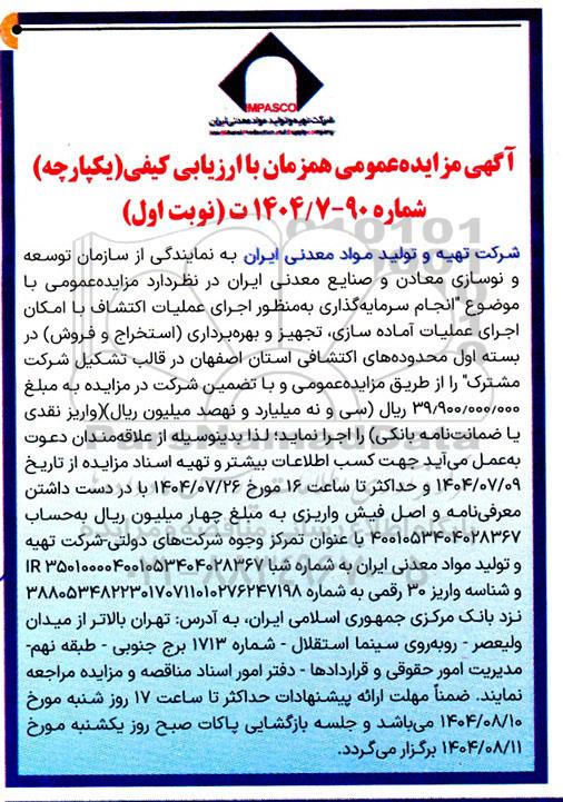 شرکت تهیه و تولید مواد معدنی ایران به نمایندگی از سازمان توسعه و نوسازی معادن و صنایع معدنی ایران در نظر دارد مزایده عمومی با موضوع «انجام سرمایه گذاری به منظور اجرای عملیات اکتشاف با امکان اجرای عملیات آماده سازی، تجهیز و بهره برداری (استخراج و فروش) در بسته اول محدوده های اکتشافی استان اصفهان در قالب تشکیل شرکت مشترک» را از طریق مزایده عمومی و با تضمین شرکت در مزایده به مبلغ 39.900.000.000 (سی و نه میلیارد و نهصد میلیون ریال) (واریز نقدی یا ضمانت نامه بانکی) را اجرا نماید؛ لذا بدینوسیله از علاقمندان دعوت بعمل می آید جهت کسب اطلاعات بیشتر و تهیه اسناد مزایده از تاریخ 1404.07.09 و حداکثر تا ساعت 16 مورخ 1404.07.26 با در دست داشتن معرفی نامه و اصل فیش واریزی به مبلغ چهار میلیون ریال بحساب 4001053404028367 با عنوان تمرکز وجوه شرکت های دولتی - شرکت تهیه و تولید مواد معدنی ایران به شماره شبا IR350100004001053404028367 و شناسه واریز 30 رقمی به شماره 388053482230170711010276247198 نزد بانک مرکزی جمهوری اسلامی ایران، به آدرس: تهران بالاتر از میدان ولیعصر - روبروی سینما استقلال - شماره 1713 برج جنوبی - طبقه نهم -مدیریت امور حقوقی و قراردادها - دفتر امور اسناد مناقصه و مزایده مراجعه نمایند. ضمنا مهلت ارائه پیشنهادات حداکثر تا ساعت 17 روز شنبه مورخ 1404.08.10 می باشد و جلسه بازگشایی پاکات صبح روز یکشنبه مورخ 1404.08.11 برگزار می گردد.