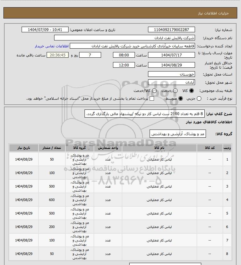 شرح کلی نیاز: 8 قلم به تعداد 2100 ست لباس کار دو تیکه /پیشنهاد مالی بارگذاری گردد.
