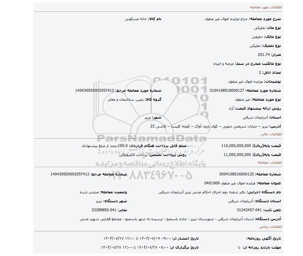 13 مزایده مال غیر منقول 9810122 1404/08/15 new not special not payed آذربایجان شرقی