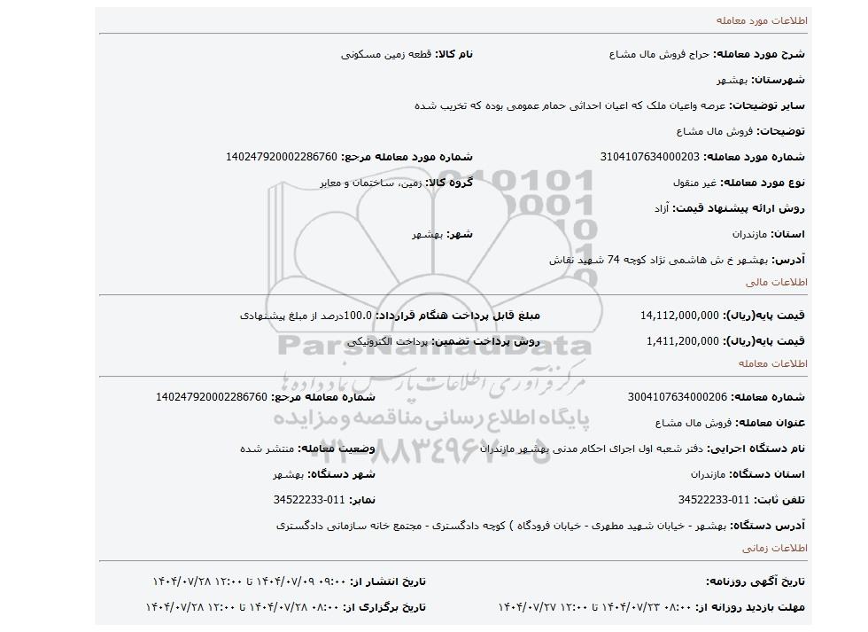 | شماره مورد معامله: 3104107634000203 | شماره مورد معامله مرجع: 140247920002286760 | |