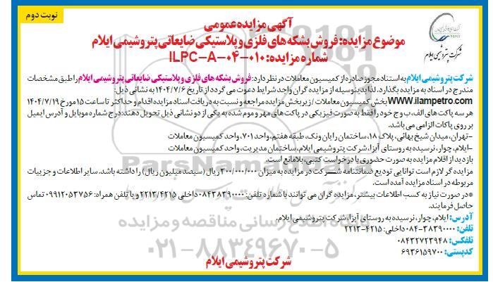 شرکت پتروشیمی ایلام به استناد مجوز صادره از کمیسیون معاملات، در نظر، فروش بشکه های فلزی و پلاستیکی ضایعاتی پتروشیمی ایلام را طبق مشخصات مندرج در اسناد به مزایده بگذارد. لذا بدینوسیله از مزایده گران واجد شرایط دعوت می گردد از تاریخ 1404.07.06 به نشانی ذیل :