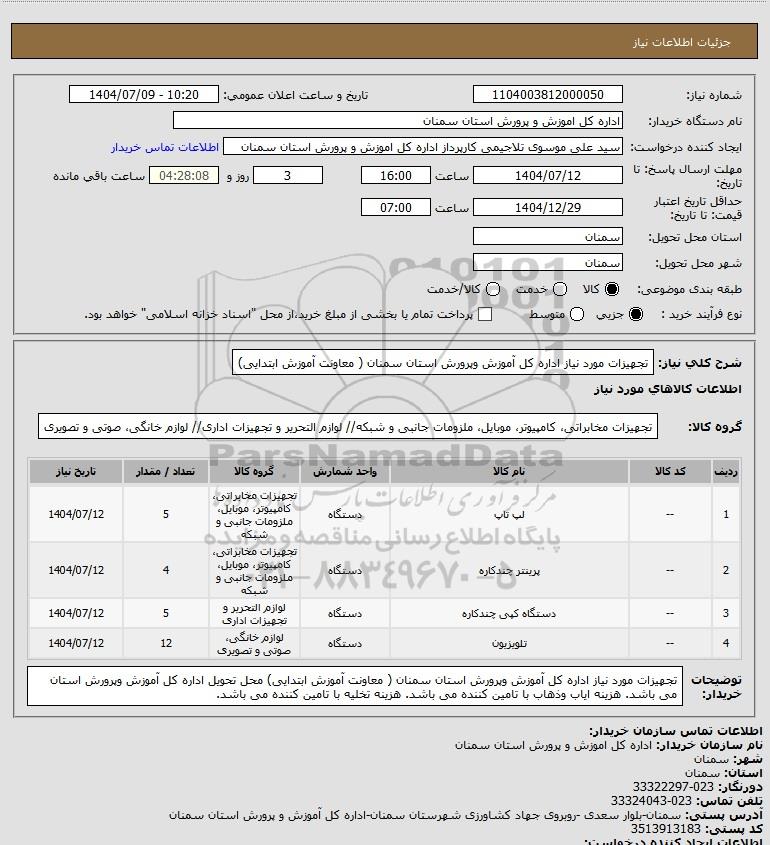 شرح کلی نیاز: تجهیزات مورد نیاز اداره کل آموزش وپرورش استان سمنان ( معاونت آموزش ابتدایی)