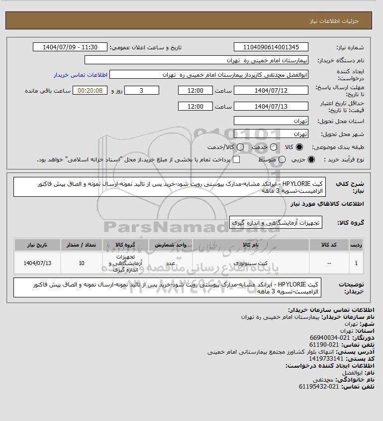 استعلام کیت HPYLORIE - ایرانکد مشابه-مدارک پیوستی رویت شود-خرید پس از تائید نمونه-ارسال نمونه و الصاق پیش فاکتور الزامیست-تسویه 3 ماهه, استعلام کیت HPYLORIE - ایرانکد مشابه-مدارک پیوستی رویت شود-خرید پس از تائید نمونه-ارسال نمونه و الصاق پیش فاکتور الزامیست-تسویه 3 ماهه