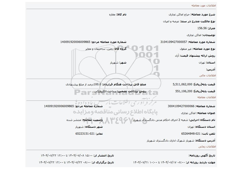 شرح مورد معامله: حراج اماکن تجارینام کالا: مغازه