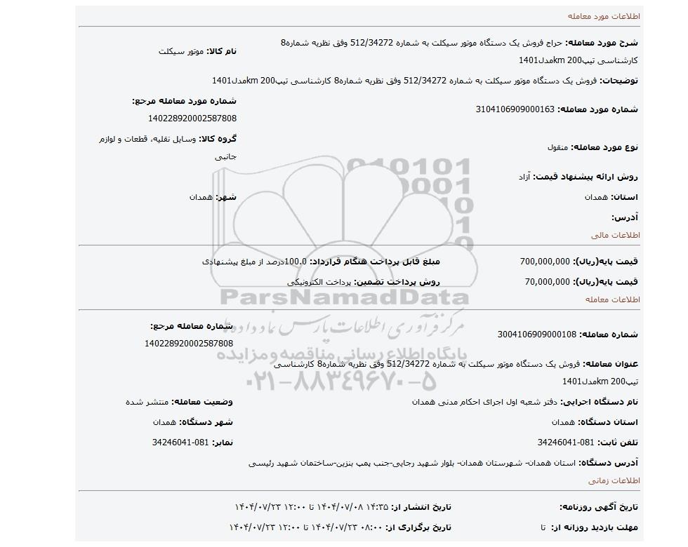 | عنوان معامله: فروش یک دستگاه موتور سیکلت به شماره 512/34272 وفق نظریه شماره8 کارشناسی تیپ200 kmمدل1401 | ||