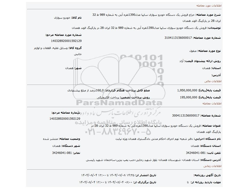 | عنوان معامله: فروش یک دستگاه خودرو سواری سایپا مدل1390نقره آبی به شماره 989 ط 32 ایران 28 در پارکینگ الوند همدان | ||