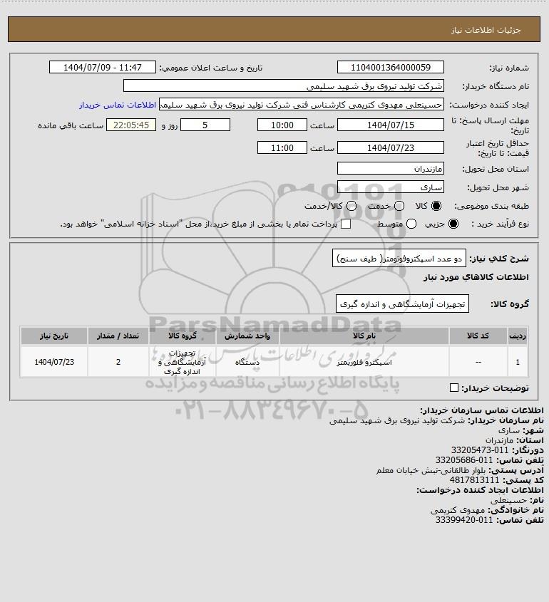 | 1 | -- | اسپکترو فلوریمتر | دستگاه | تجهیزات آزمایشگاهی و اندازه گیری | 2 | 1404/07/23 |