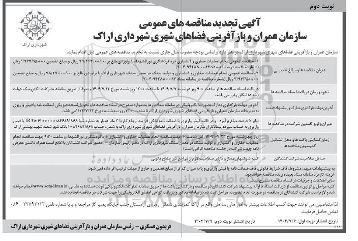 آگهی تجدید مناقصه های عمومی سازمان عمران و بازآفرینی فضاهای شهری شهرداری اراک ؟