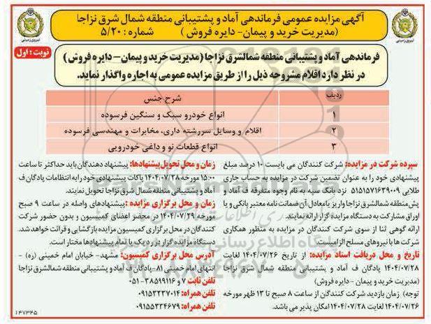 آگهی مزایده عمومی فرماندهی آماد و پشتیبانی منطقه شمال شرق نزاجا (مدیریت خرید و پیمان دایره فروش ) شماره : 5.20