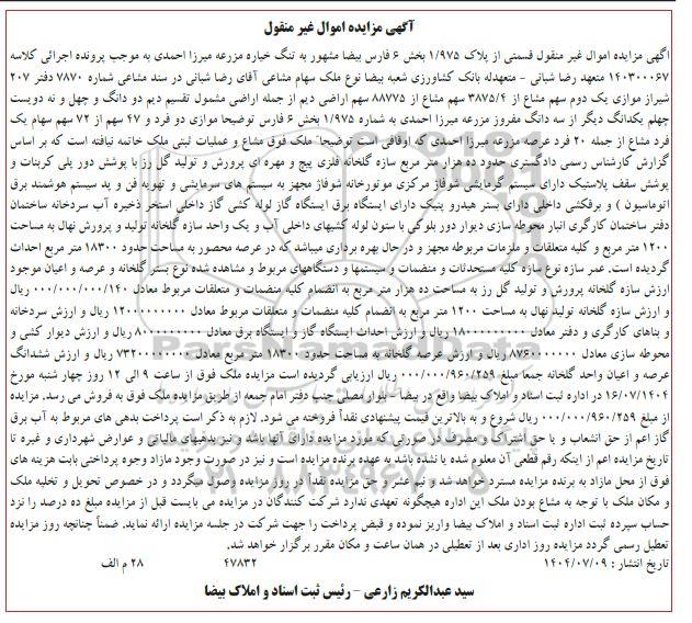 اگهی مزایده اموال غیر منقول قسمتی از پلاک 1.975 بخش 6 فارس بیضا مشهور به تنگ خیاره مزرعه میرزا احمدی به موجب پرونده اجرائی کلاسه 140300067 متعهد رضا شبانی - متعهدله بانک کشاورزی شعبه بیضا نوع ملک سهام مشاعی آقای رضا شبانی در سند مشاعی شماره 7870 دفتر 207 شیراز موازی یک دوم سهم مشاع از 3875.4 سهم مشاع از 88775 سهم اراضی دیم از جمله اراضی مشمول تقسیم دیم دو دانگ و چهل و نه دویست چهلم یکدانگ دیگر از سه دانگ مفروز مزرعه میرزا احمدی به شماره 1.975 بخش 6 فارس توضیحا موازی دو فرد و 47 سهم از 72 سهم سهام یک فرد مشاع از جمله 20 فرد عرصه مزرعه میرزا احمدی که اوقافی است توضیحا ملک فوق مشاع و عملیات ثبتی ملک خاتمه نیافته است که بر اساس گزارش کارشناس رسمی دادگستری حدود ده هزار متر مربع سازه گلخانه فلزی پیچ و مهره ای پرورش و تولید گل رز با پوشش دور پلی کربنات و پوشش سقف پلاستیک دارای سیستم گرمایشی شوفاژ مرکزی موتورخانه شوفاژ مجهز به سیستم های سرمایشی و تهویه فن و پد سیستم هوشمند برق اتوماسیون ) و برفکشی داخلی دارای بستر هیدرو پنیک دارای ایستگاه برق ایستگاه گاز لوله کشی گاز داخلی استخر ذخیره آب سردخانه ساختمان | دفتر ساختمان کارگری انبار محوطه سازی دیوار دور بلوکی با ستون لوله کشیهای داخلی آب و یک واحد سازه گلخانه تولید و پرورش نهال به مساحت 1200 متر مربع و کلیه متعلقات و ملزمات مربوطه مجهز و در حال بهره برداری میباشد که در عرصه محصور به مساحت حدود 18300 متر مربع احداث | گردیده است. عمر سازه نوع سازه کلیه مستحدثات و منضمات و سیستمها و دستگاههای مربوط و مشاهده شده نوع بستر گلخانه و عرصه و اعیان موجود ارزش سازه گلخانه پرورش و تولید گل رز به مساحت ده هزار متر مربع به انضمام کلیه منضمات و متعلقات مربوط معادل 140.000.000.000 ریال | و ارزش سازه گلخانه تولید نهال به مساحت 1200 متر مربع به انضمام کلیه منضمات و متعلقات مربوط معادل 12000000000 ریال و ارزش سردخانه و بناهای کارگری و دفتر معادل 18000000000 ریال و ارزش احداث ایستگاه گاز و ایستگاه برق معادل 8000000000 ریال و ارزش دیوار کشی و محوطه سازی معادل 8760000000 ریال و ارزش عرصه گلخانه به مساحت حدود 18300 متر مربع معادل 73200000000 ریال و ارزش ششدانگ عرصه و اعیان واحد گلخانه جمعا مبلغ 259.960.000.000 ریال ارزیابی گردیده است مزایده ملک فوق از ساعت 9 الی 12 روز چهار شنبه مورخ 1404.7.16 در اداره ثبت اسناد و املاک بیضا واقع در بیضا - بلوار مصلی جنب دفتر امام جمعه از طریق مزایده ملک فوق به فروش می رسد. مزایده از مبلغ 259.960.000.000 ریال شروع و به بالاترین قیمت پیشنهادی نقداً فروخته می شود. لازم به ذکر است پرداخت بدهی های مربوط به آب برق گاز اعم از حق انشعاب و با حق اشتراک و مصرف در صورتی که مورد مزایده دارای آنها باشد و نیز بدهیهای مالیاتی و عوارض شهرداری و غیره تا تاریخ مزایده اعم از اینکه رقم قطعی آن معلوم شده یا نشده باشد به عهده برنده مزایده است و نیز در صورت وجود مازاد وجوه پرداختی بابت هزینه های فوق از محل مازاد به برنده مزایده مسترد خواهد شد و نیم عشر و حق مزایده نقداً در روز مزایده وصول میگردد و در خصوص تحویل و تخلیه ملک و مکان ملک با توجه به مشاع بودن ملک این اداره هیچگونه تعهدی ندارد شرکت کنندگان در مزایده می بایست قبل از مزایده مبلغ ده درصد را نزد حساب سپرده ثبت اداره ثبت اسناد و املاک بیضا واریز نموده و قبض پرداخت را جهت شرکت در جلسه مزایده ارائه نماید. ضمناً چنانچه روز مزایده تعطیل رسمی گردد مزایده روز اداری بعد از تعطیلی در همان ساعت و مکان مقرر برگزار خواهد شد.