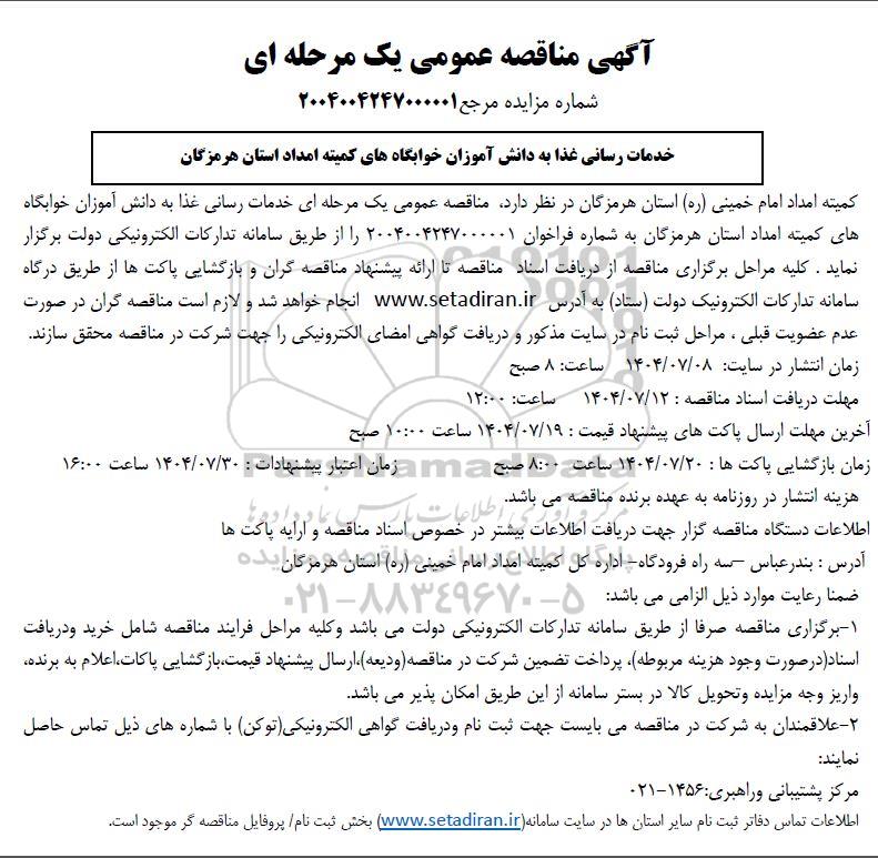 کمیته امداد امام خمینی (ره) استان هرمزگان در نظر دارد مناقصه عمومی یک مرحله ای خدمات رسانی غذا به دانش آموزان خوابگاه های کمیته امداد استان هرمزگان به شماره فراخوان 2004004247000001 را از طریق سامانه تدارکات الکترونیکی دولت برگزار نماید . کلیه مراحل برگزاری مناقصه از دریافت اسناد مناقصه تا ارائه پیشنهاد مناقصه گران و بازگشایی پاکت ها از طریق درگاه سامانه تدارکات الکترونیک دولت (ستاد) به آدرس ستاد ایران  انجام خواهد شد و لازم است مناقصه گران در صورت عدم عضویت قبلی ، مراحل ثبت نام در سایت مذکور و دریافت گواهی امضای الکترونیکی را جهت شرکت در مناقصه محقق سازند.